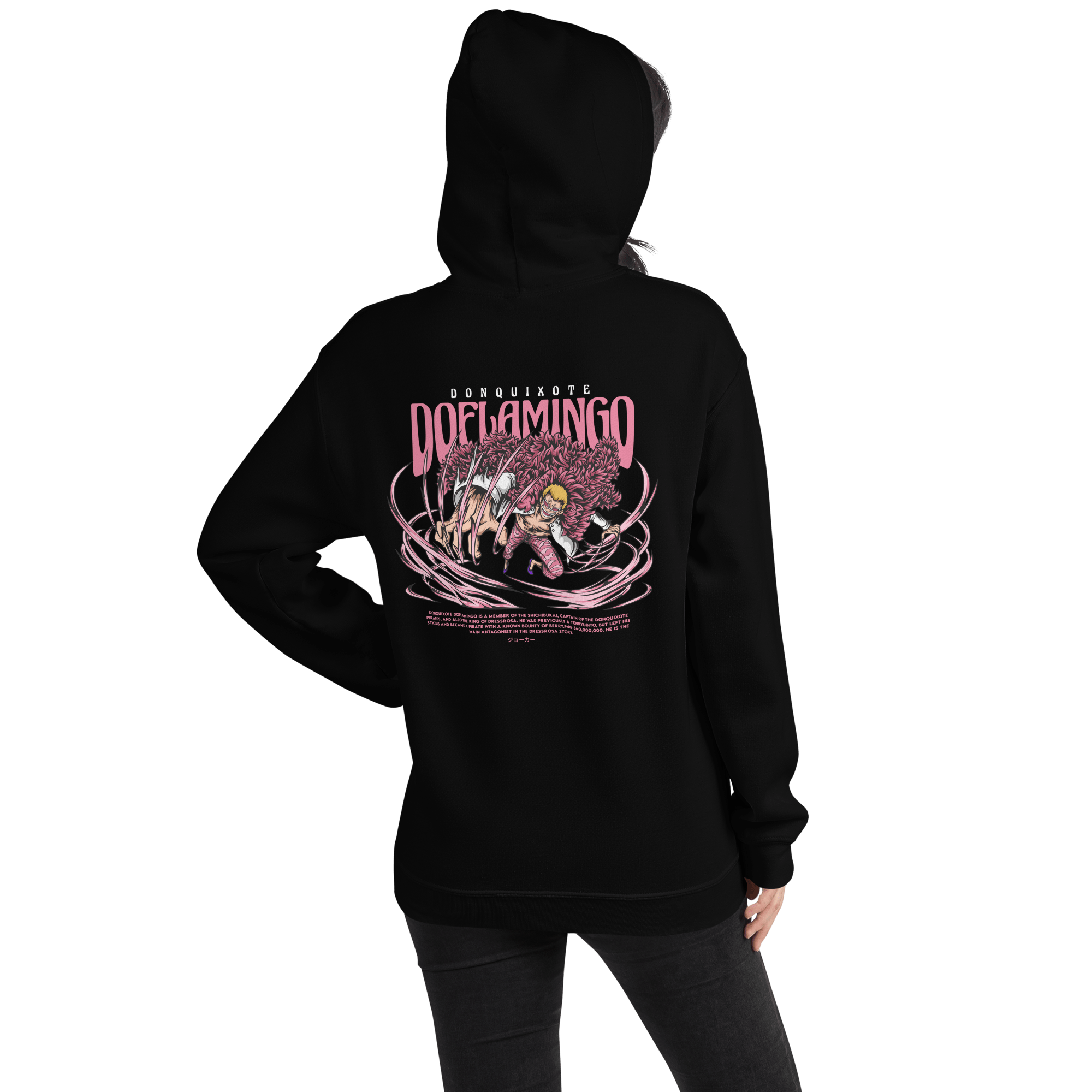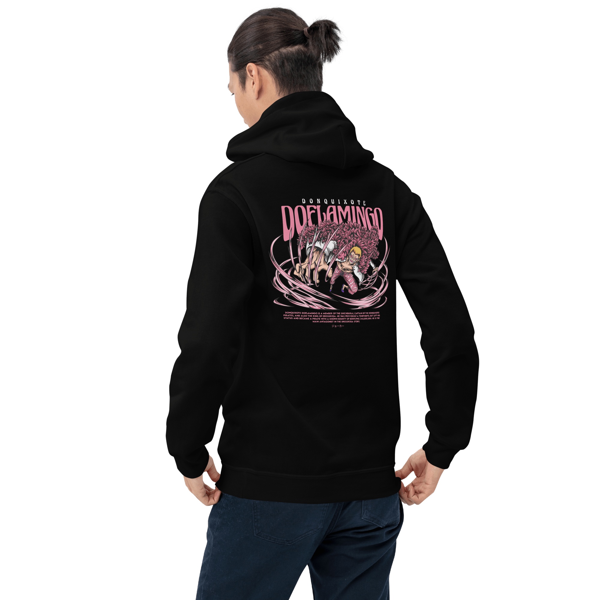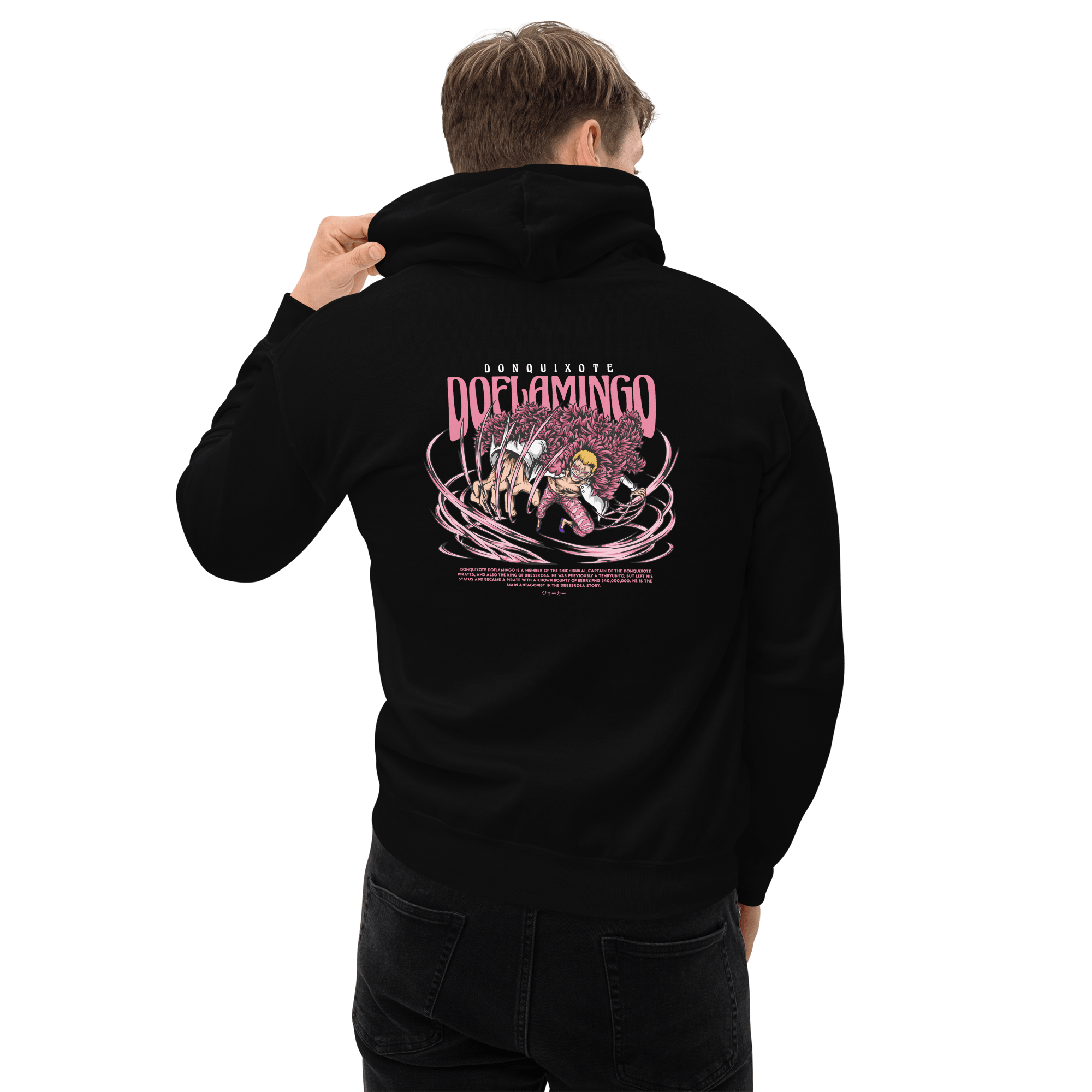Delve into the depths of darkness with the Premium Doflamingo Tyrant Hoodie, paying homage to one of the most formidable antagonists in the One Piece saga. Infused with the essence of tyranny and power, this hoodie stands as a testament to Doflamingo’s indomitable presence.